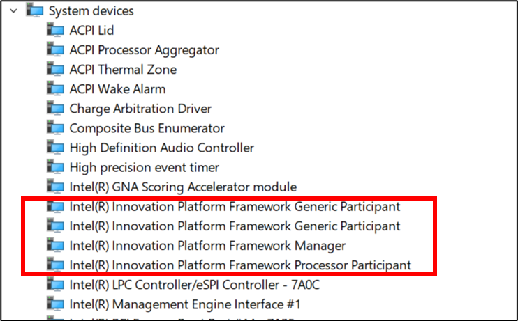 9. 在"系统装置"下找到所有以Intel Innovation Platform Framework开头的驱动,并重复步骤六卸载驱动