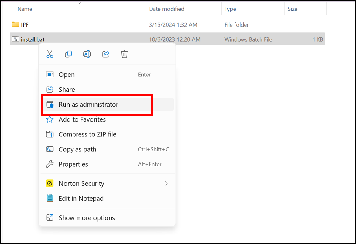 11. 打开IPF文件夹,右键点击Install.batch,选择"以系统管理员权限执行" (请确保安装IPF驱动的窗口自动跳转结束后,再进行下一步骤)