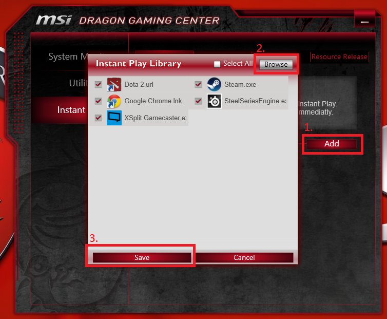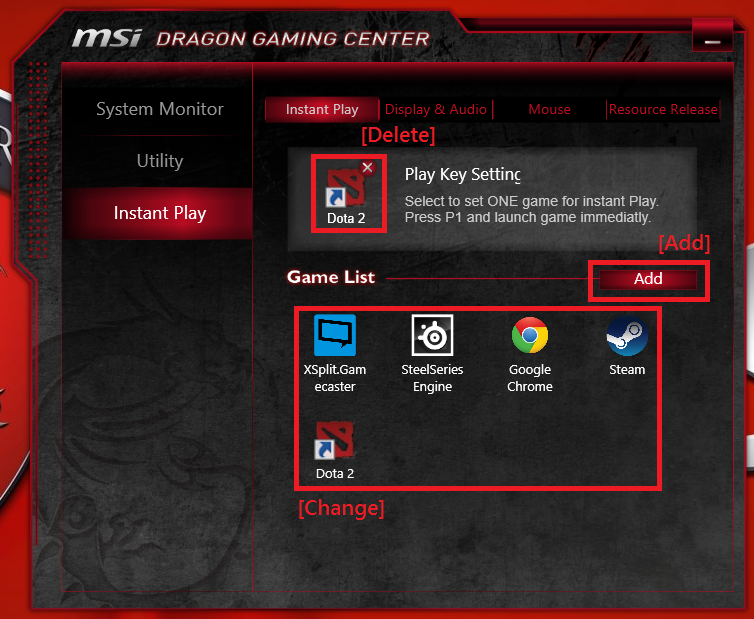 要更改过去的设定,请执行Dragon Gaming Center并选择"Instant Play"页面来删除(Delete)、新增(Add)及修改设定。