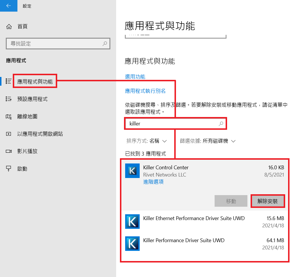 b. 移除Killer Control Center和所有搜寻得到的Killer相关驱动程序
