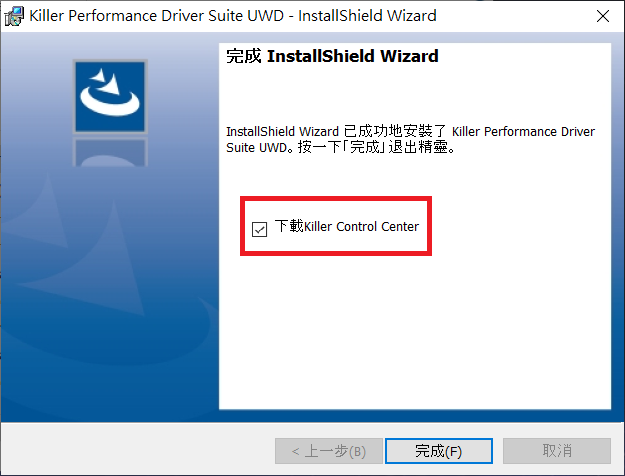 当看到此选项时,请先连接网络,然后开启此选项再点选 “Finish”。此选项将会自动开启Killer Control Center (UWP)的下载连结