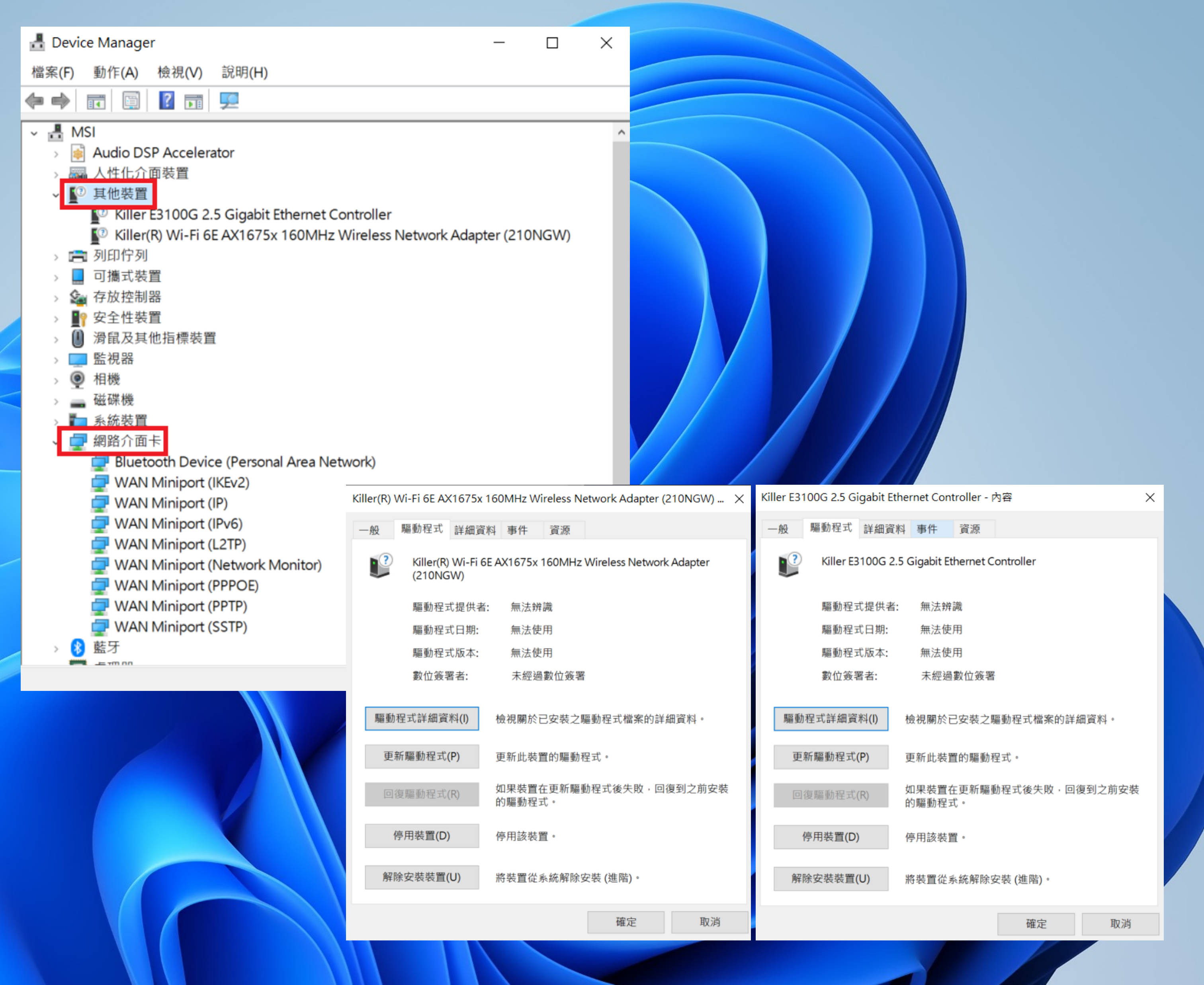 d. 打开设备管理器,找到 “其他装置” 或者 “网络适配器” 并双击确认其中的Killer装置。驱动程序版本应该要显示 “无法使用”,代表驱动程序已被完整移除
