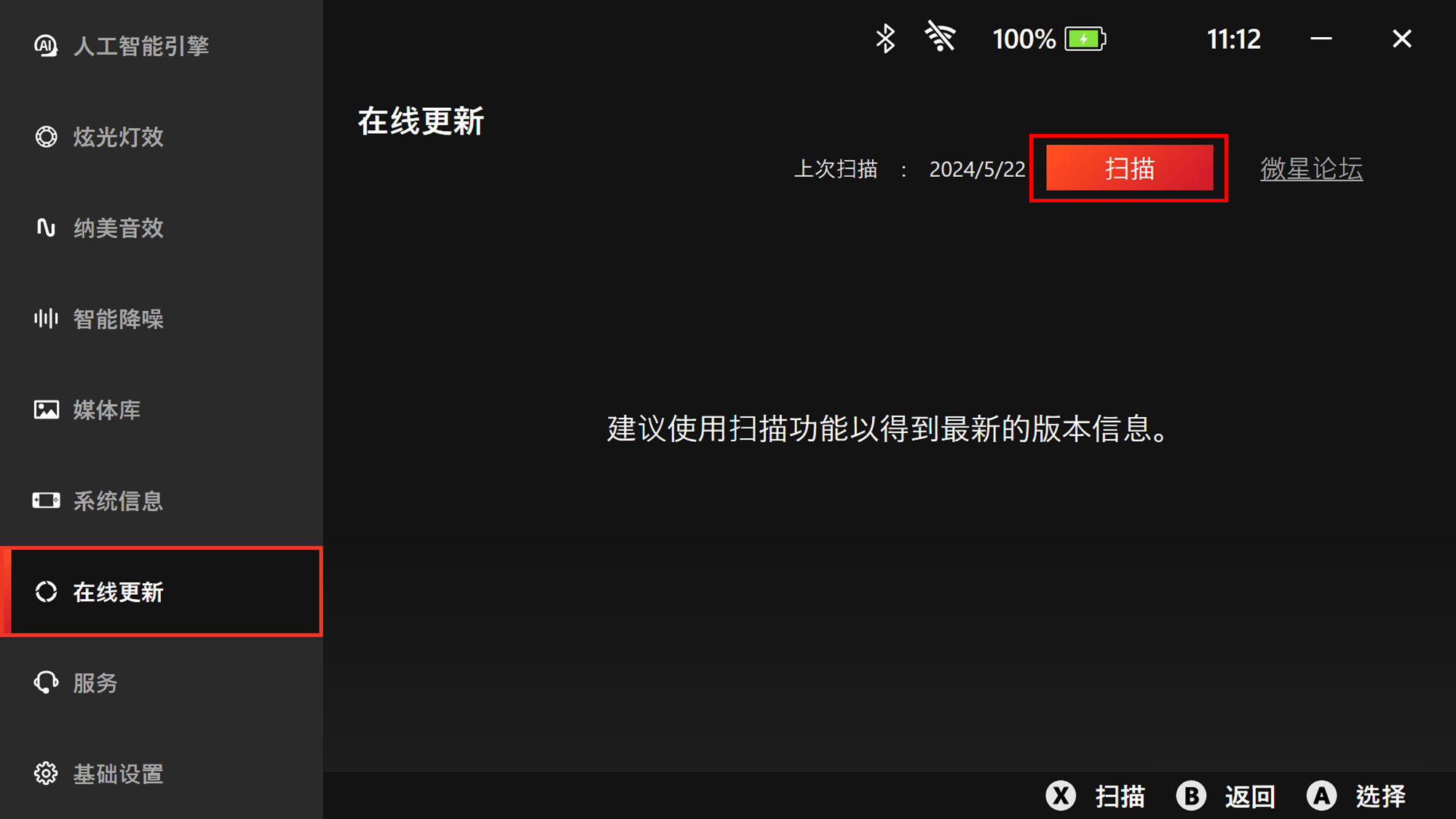 2. 至设定 > "在线更新",然后按下"扫描"按钮检查更新