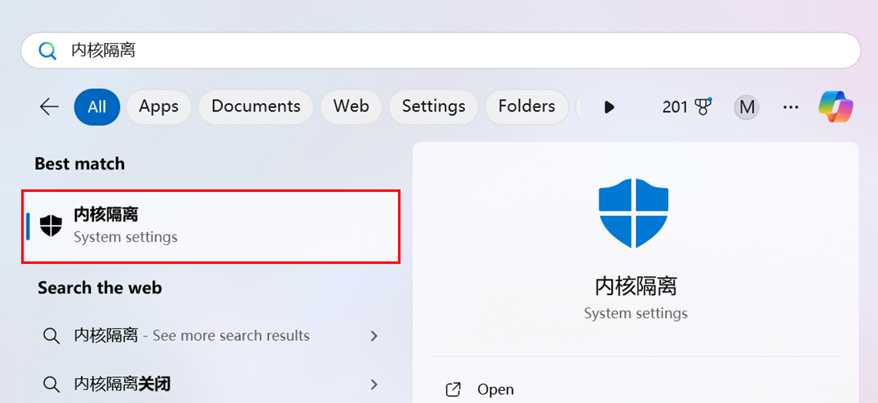 1. 在 Windows 搜寻列中输入“內核隔离”,然后开启系统设定页面。