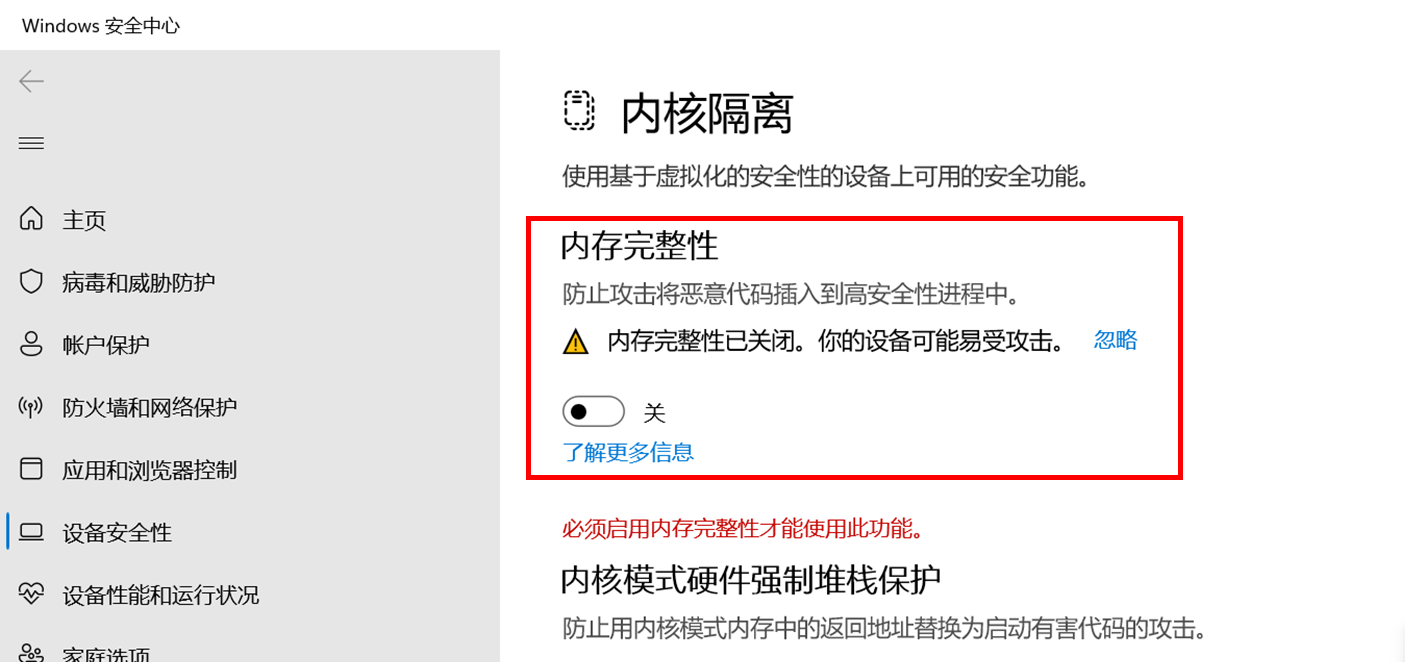 选项一、关闭“內核隔离”