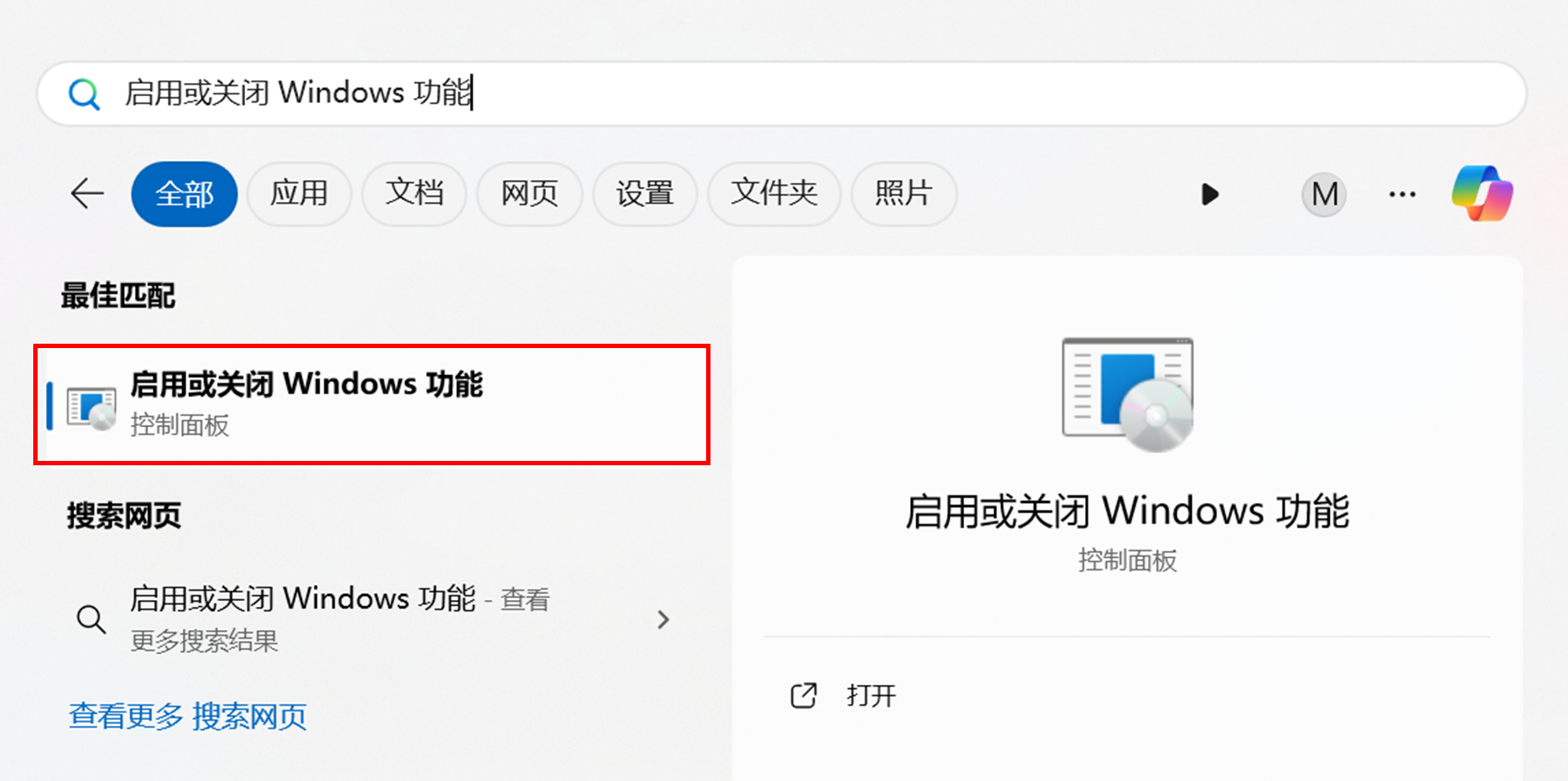 1. 在 Windows 搜寻列中输入“启用或关闭Windows功能”,然后开启设定页面。