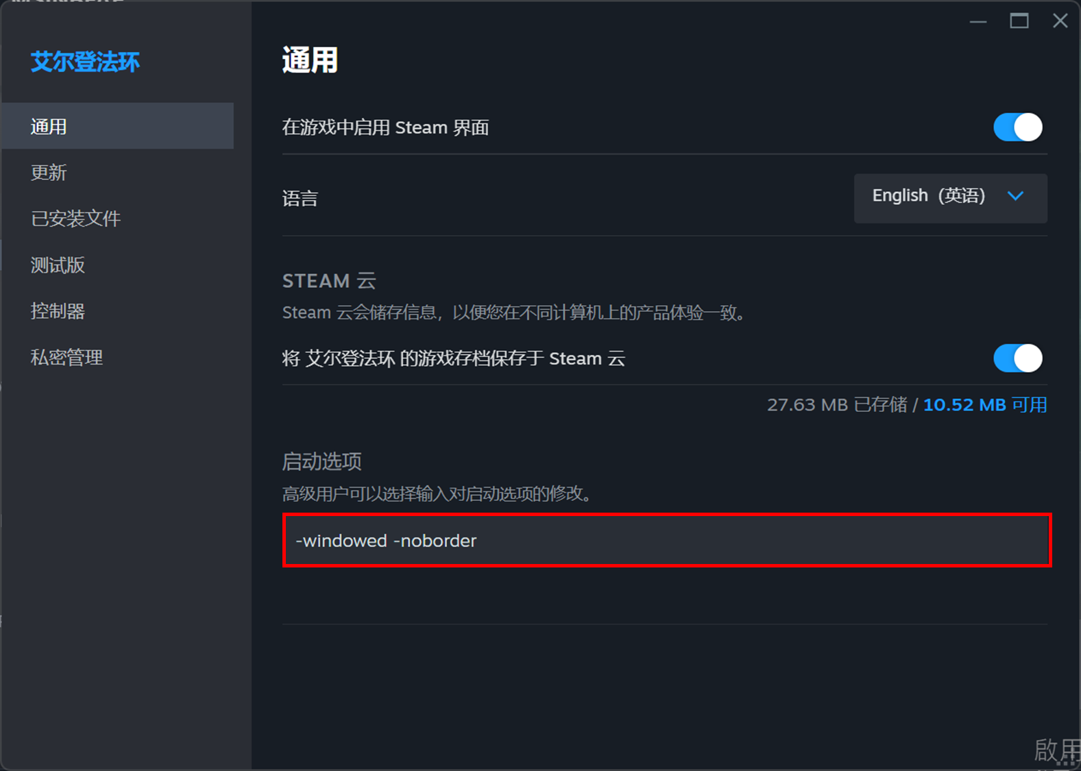 b. 在"通用"页面下,在启动选项中输入"windowed –noborder",然后启动游戏。