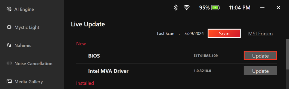 MSI 定期透过在线更新(Live Update) 发布 Claw 的 BIOS 韧体、Intel 显示适配器驱动程序和 MSI Center M 软件更新。