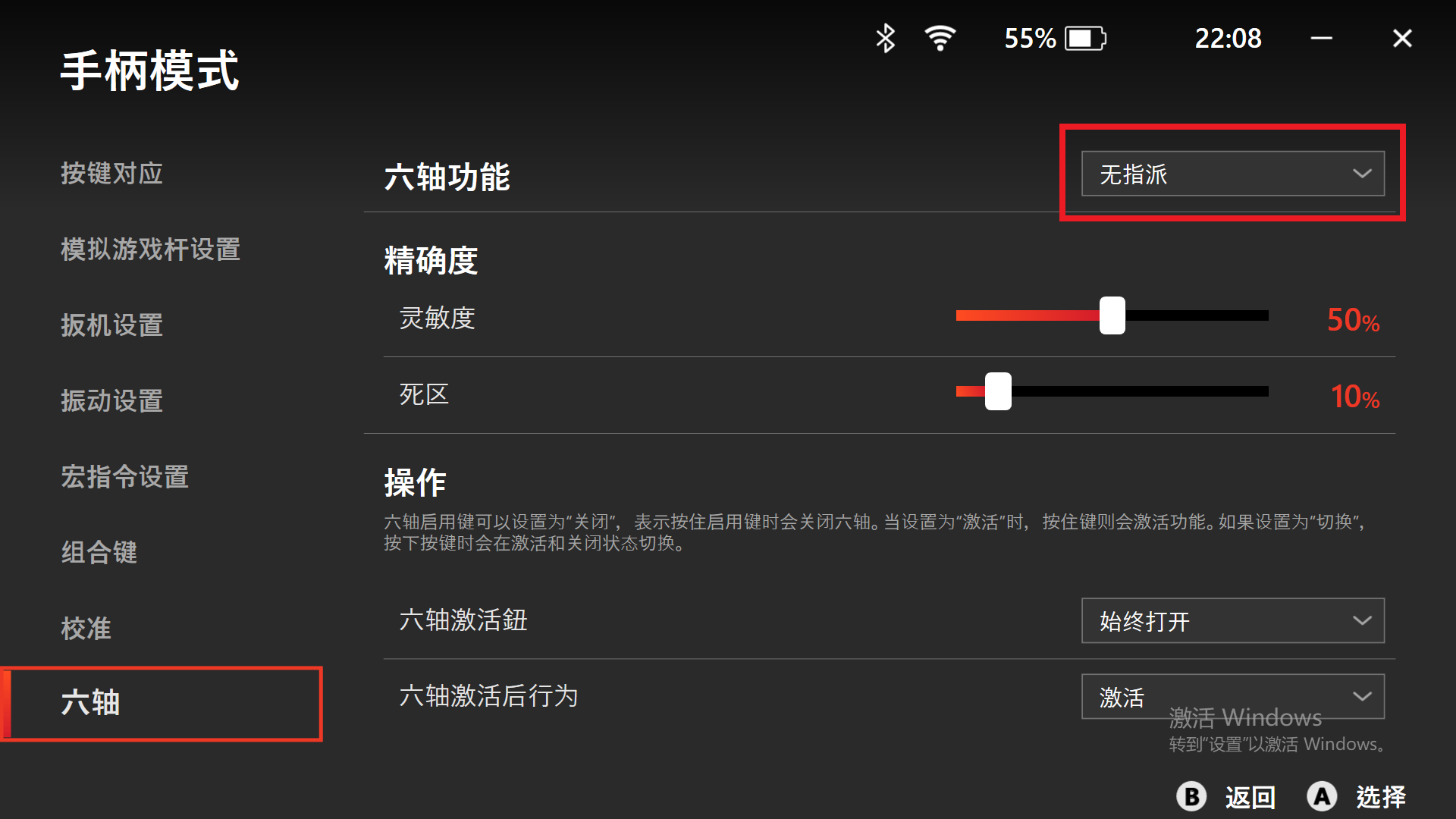 ii. 在"六轴功能"选择"无指派"以停止指派陀螺仪至任何硬件,游戏内即不会接收到陀螺仪讯号