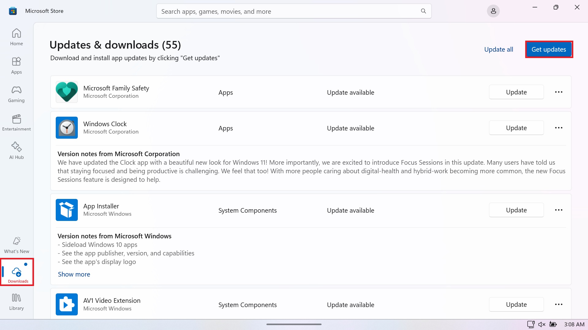 如果您在 MSI Center M 2.0 更新后无法呼叫 MSI 快速设置选单,请开启微软商城应用程序,单击左侧面板上的下载按钮,点选取得更新按钮来取得所有最新的 Xbox 应用程序更新。