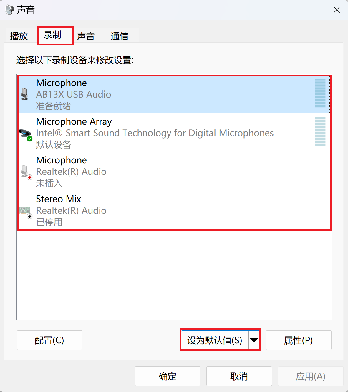 4. 单击您要使用的录制设备,然后单击"设置默认值"按钮。