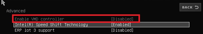 请确认BIOS内的VMD选项状态,若VMD选项设定状态有变,请调整为先前设定