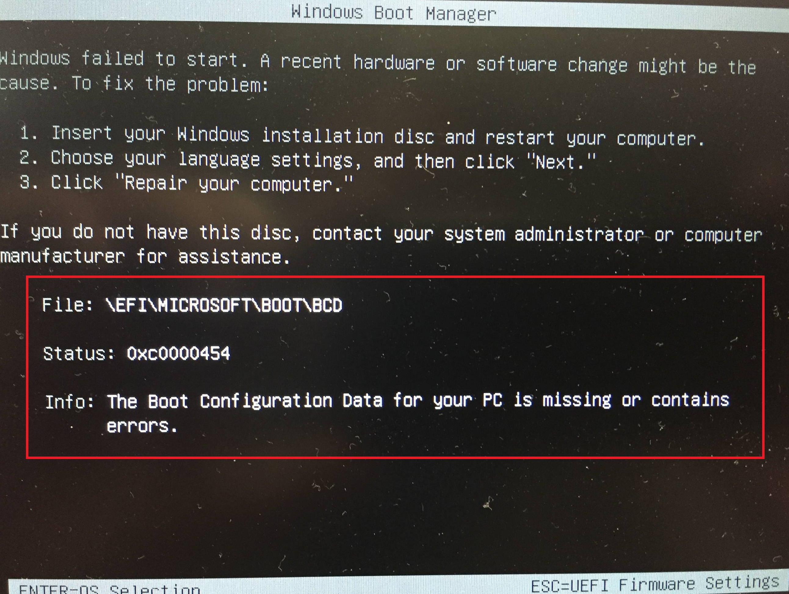 微星笔电上安装Windows 10之后,系统会显示黑屏与错误讯息0xc0000454(参见附图) 。此外,系统容易于Windows重新启动时,卡住于MSI开机图标处。