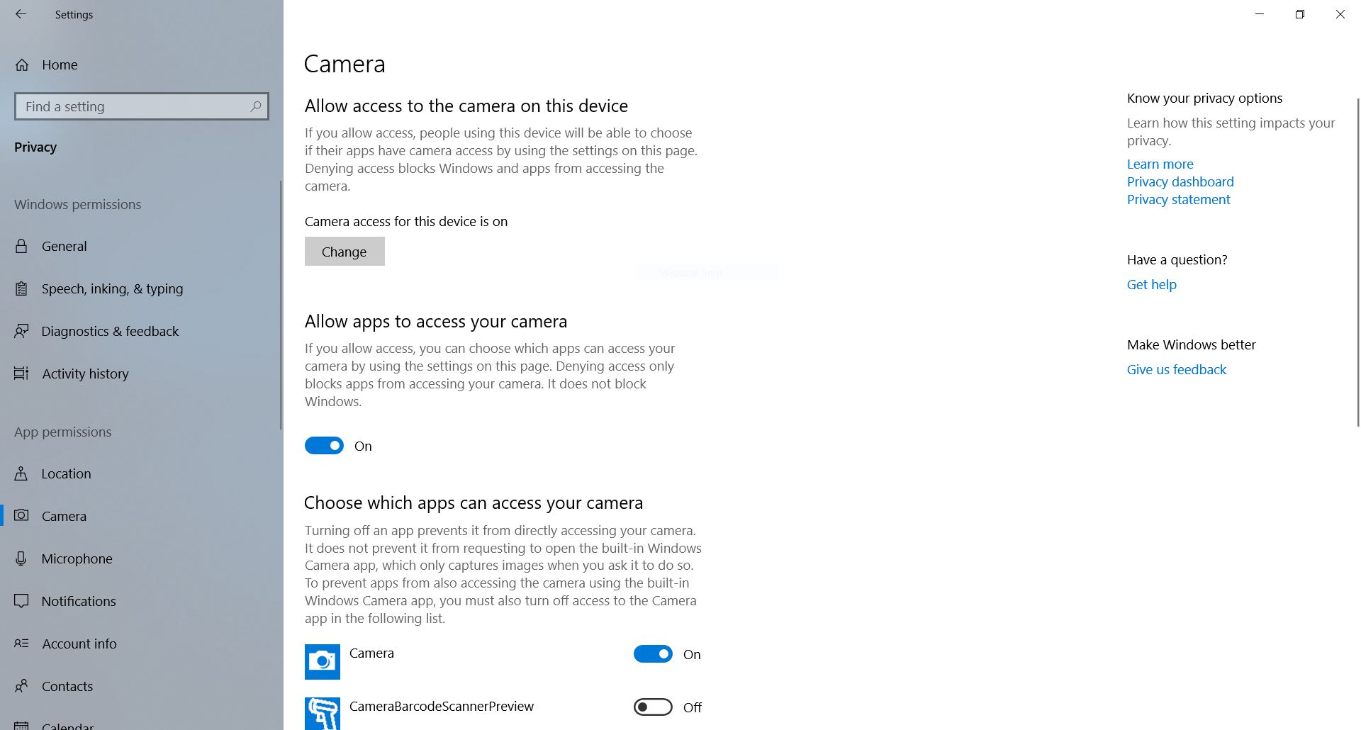 1. 将 [允许在此设备上访问相机] 功能开启。