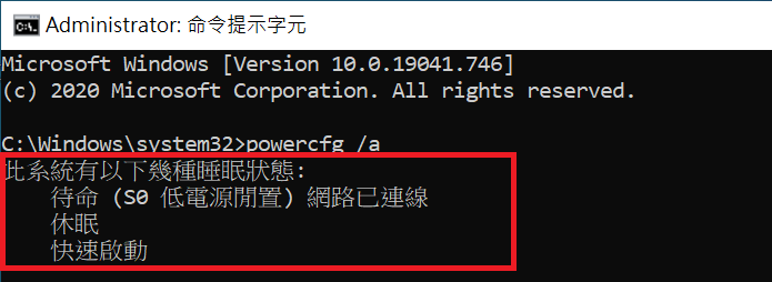 c. 输入指令"powercfg /a"再按下"Enter"键