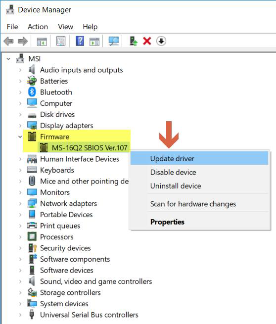 2.在"韧体"栏位,右键“MS-1XXX SBIOS Ver.XXX”并选择 "解除安装装置"