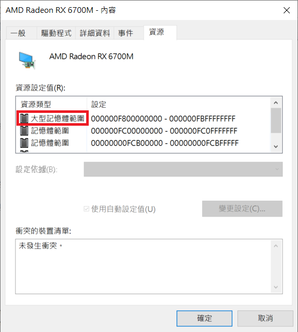3. 若在"资源"页面下可以看到"大型记忆体范围",表示AMD Smart Access Memory已正确启用。