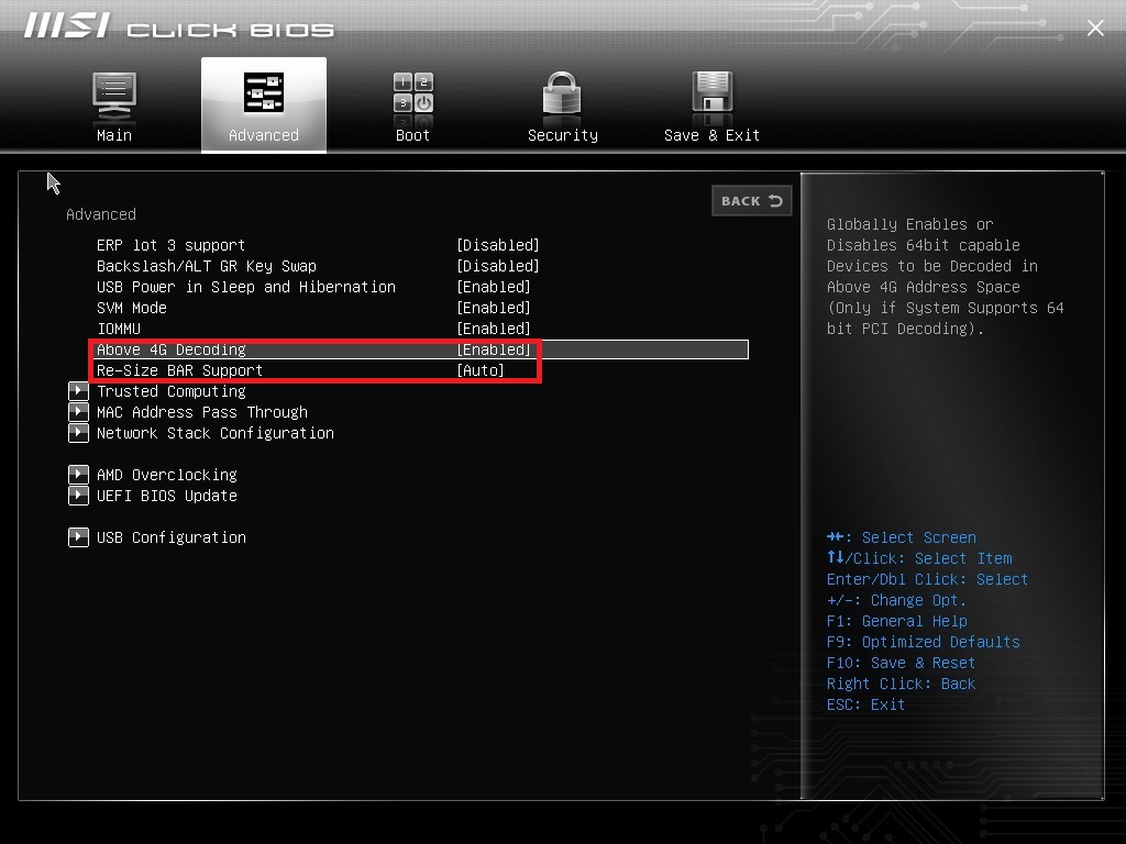 3. 若"Above 4G Decoding"已设定为"Enabled" 且"Re-Size BAR Support" 已设定为"Auto",表示AMD Smart Access Memory已正确启用。