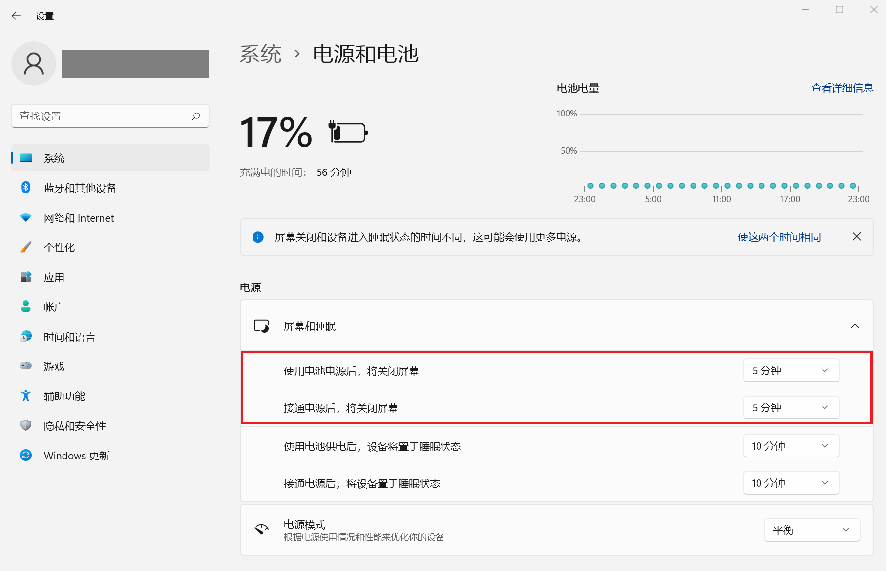 1. 选择 Windows键 > 设定 > 电源和电池(Power & battery)> 屏幕和睡眠(Screen and sleep)