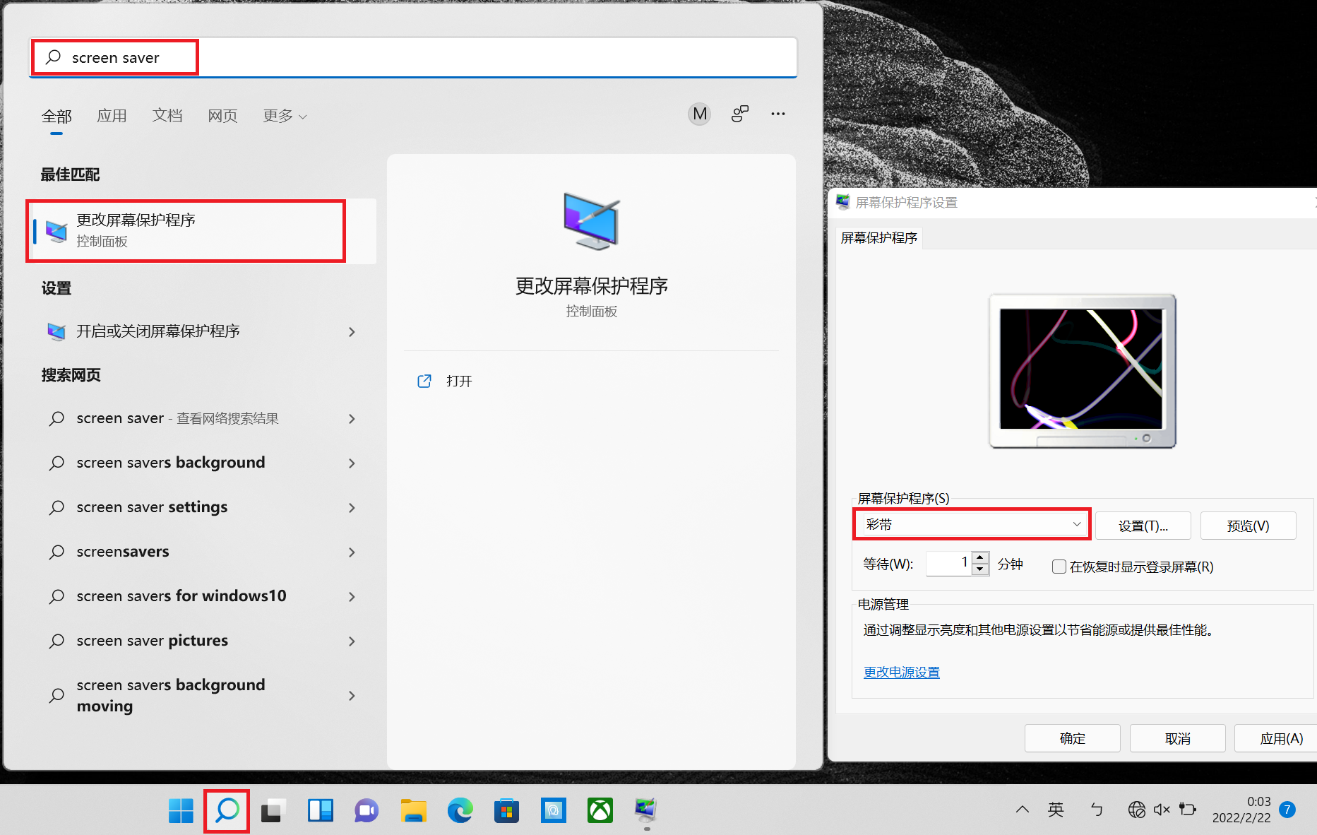 1. 选择搜寻图示(或按 Windows键 + S)> 输入"屏幕保护(screen saver)" > 选择"更改屏幕保护"