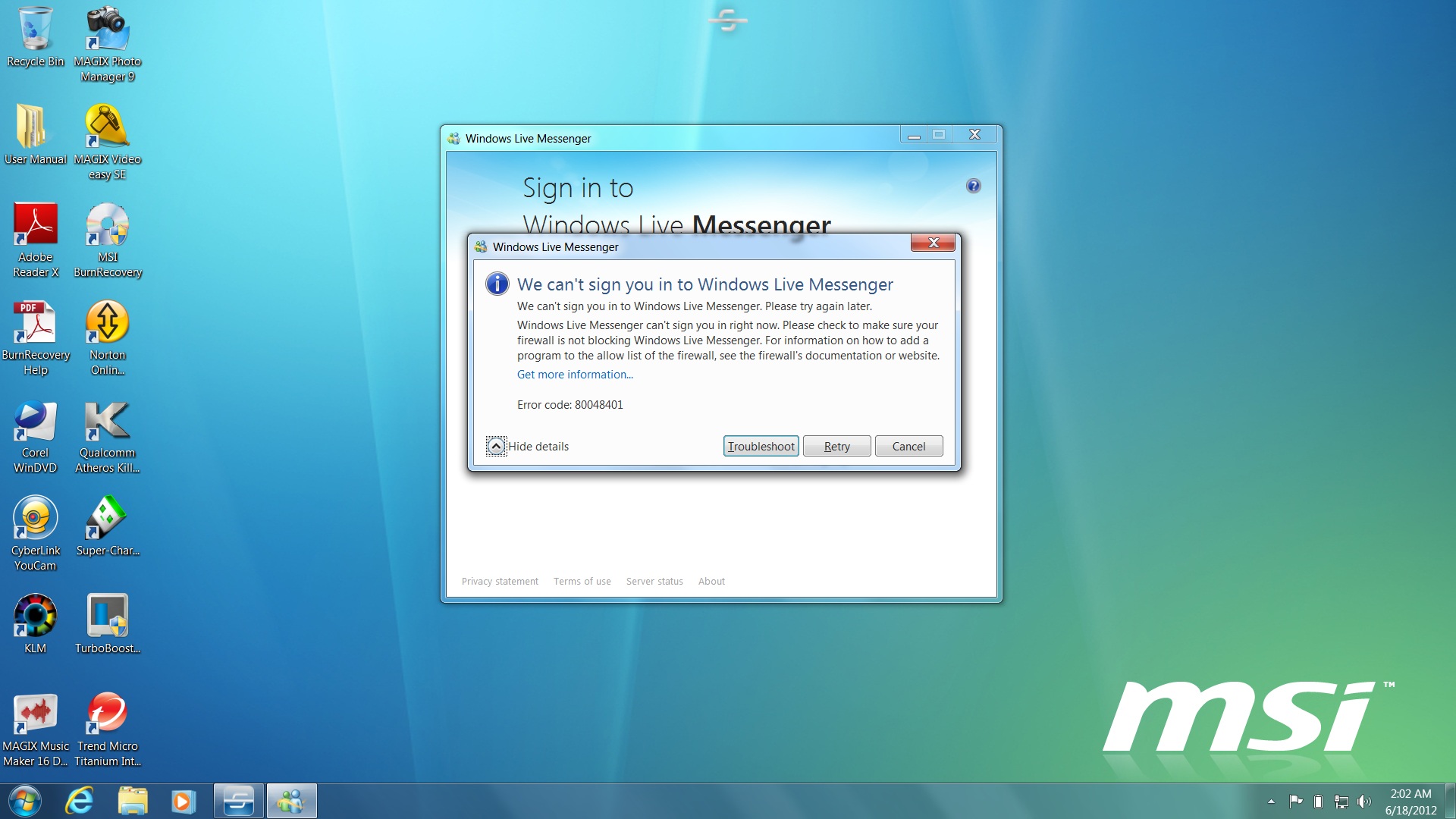 MSN为何一直无法登入? 错误代码是80048401.