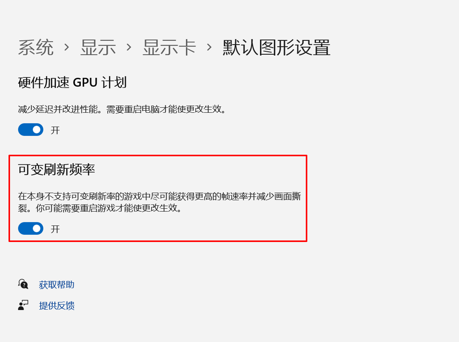 点选Windows图标 > 设置 > 显示 > 显示卡 > 更改默认图形设置,将"可变刷新频率"选项关闭