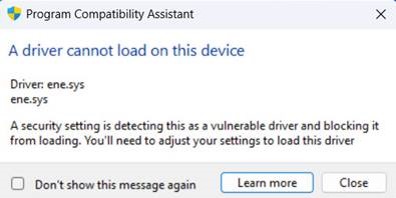 [问题排除] 每次登入系统出现程序兼容性助手指向ene.sys 的警示讯息 “A driver cannot load on this device”的视窗时该怎么办?
