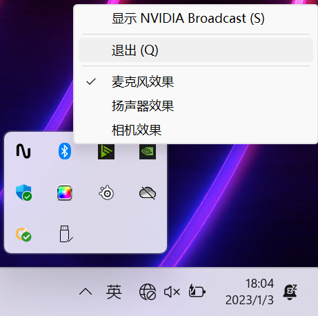 要完全退出,请于通知区域对NVIDIA Broadcast图标点击右键后选择"退出"。