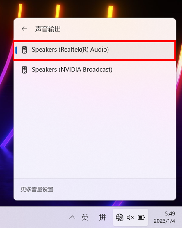 若您曾经开启过NVIDIA Broadcast应用程序,系统的声音输出装置会在软件运行后自动被切换至"NVIDIA Broadcast"而造成内建喇叭声音消失。