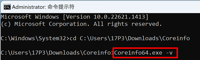 - 输入“Coreinfo64.exe -v”,然后按 Enter 键。