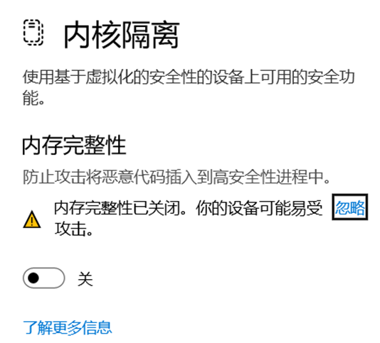 a. 在 Windows 搜索栏中,输入“内核隔离”,然后打开页面。