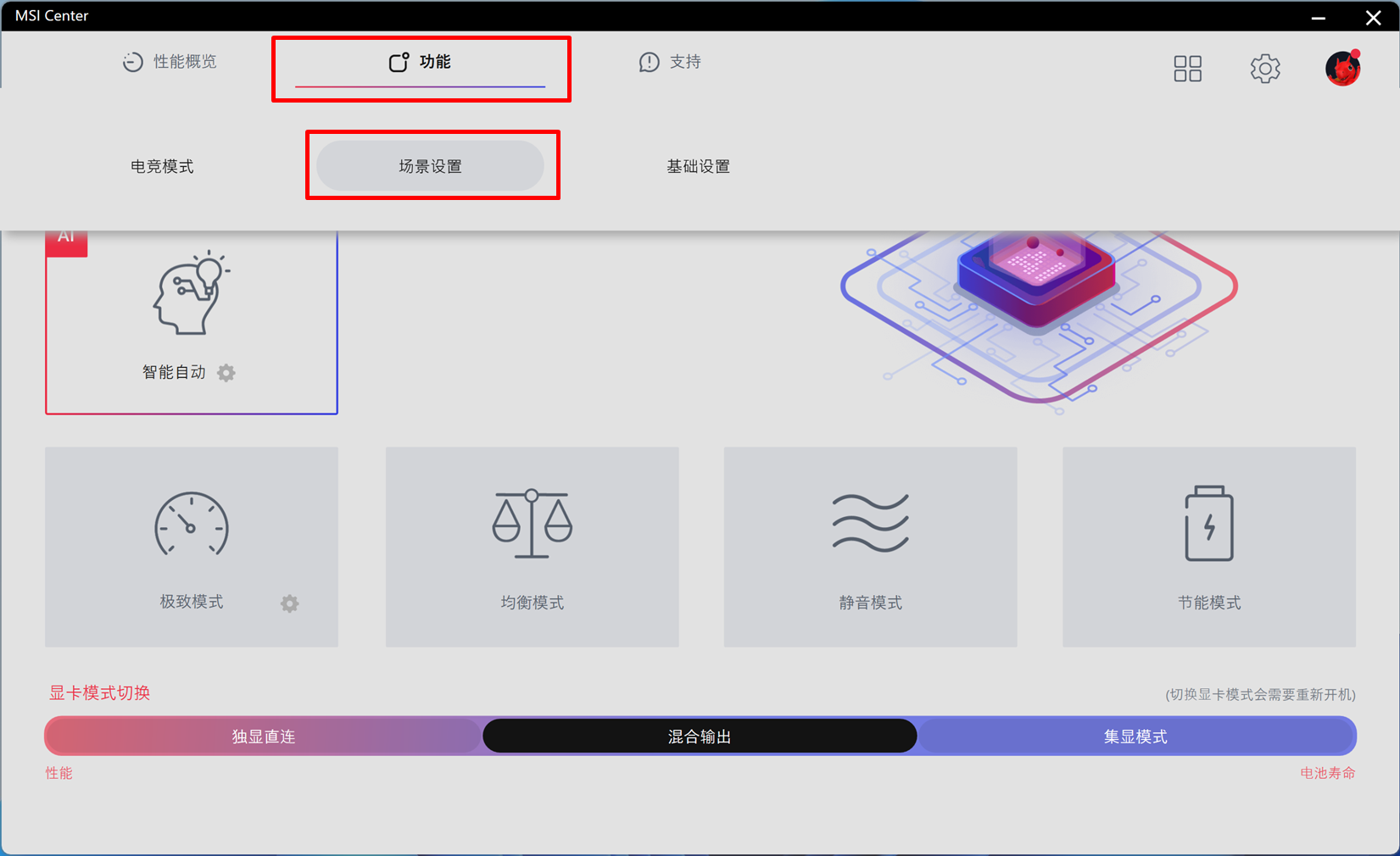 部分MSI电竞和其他系列的几款型号笔记本支持显卡模式切换,这是一种可切换图形的技术,让用户可以在混合输出和独显直连模式之间进行切换。