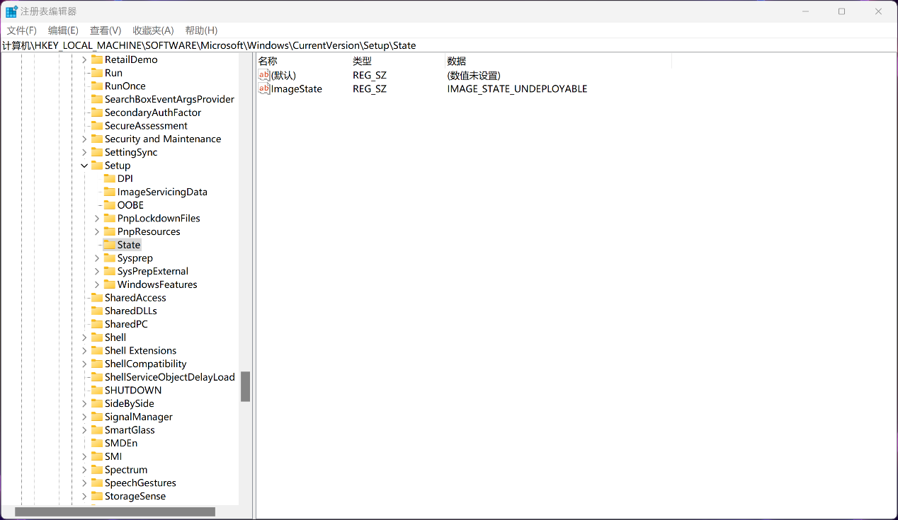 2) 如果参数显示为”IMAGE_STATE_UNDEPLOYABLE”、”IMAGE_STATE_GENERALIZE_RESEAL_TO_OOBE”等状态,表示Windows系统的状态存在异常,按照以下步骤调整注册表来解决问题。
