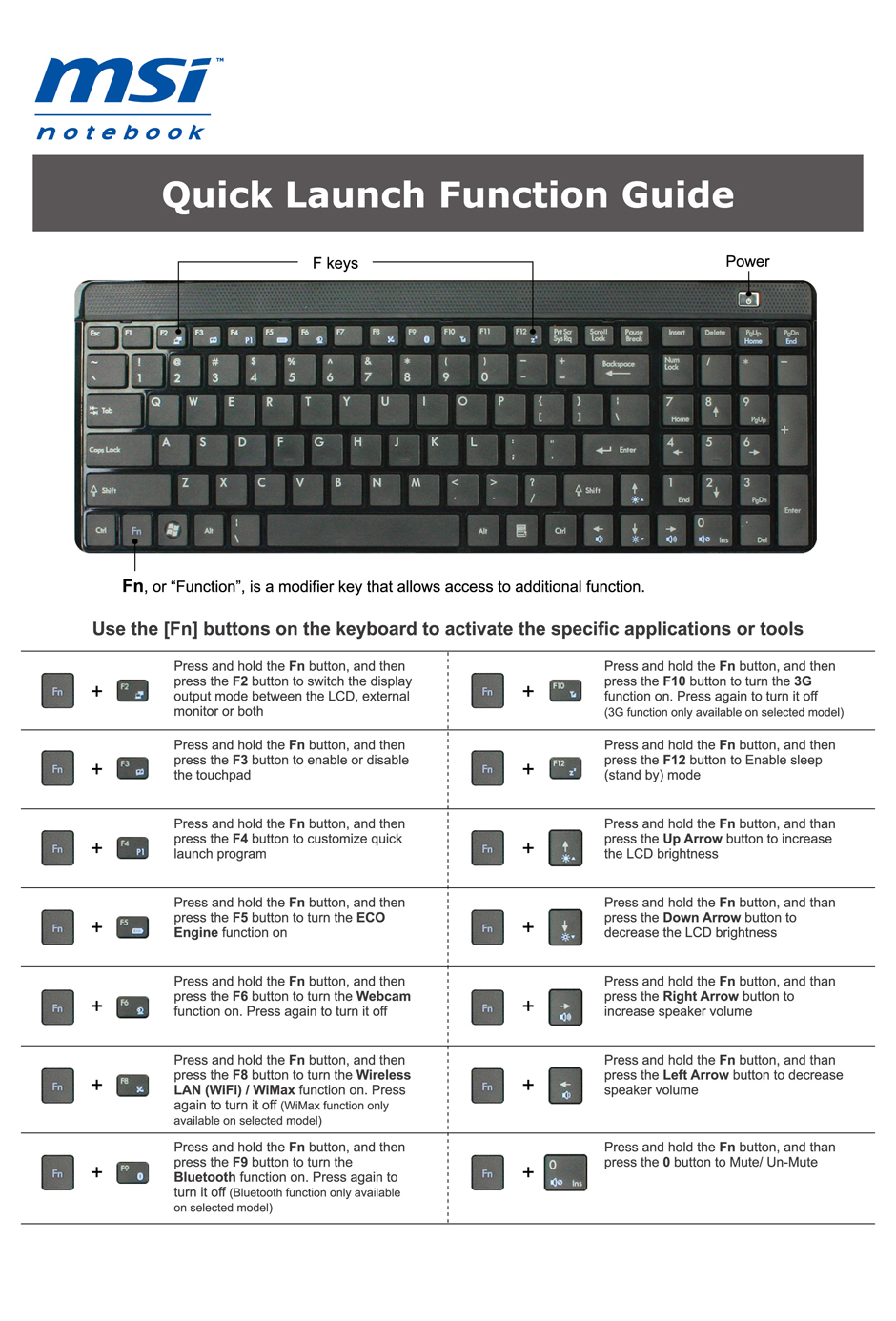 我的笔电是使用巧克力键盘,我不晓得如何去使用功能键和快捷键,像是切换显示输出,触控板、自定义键、ECO省电功能、网络摄影机、无线网络、蓝牙、系统睡眠、调整萤幕亮度、调整/静音喇叭音量。 (适用于显示萤幕为15.4"或更大尺寸的微星笔记型电脑)