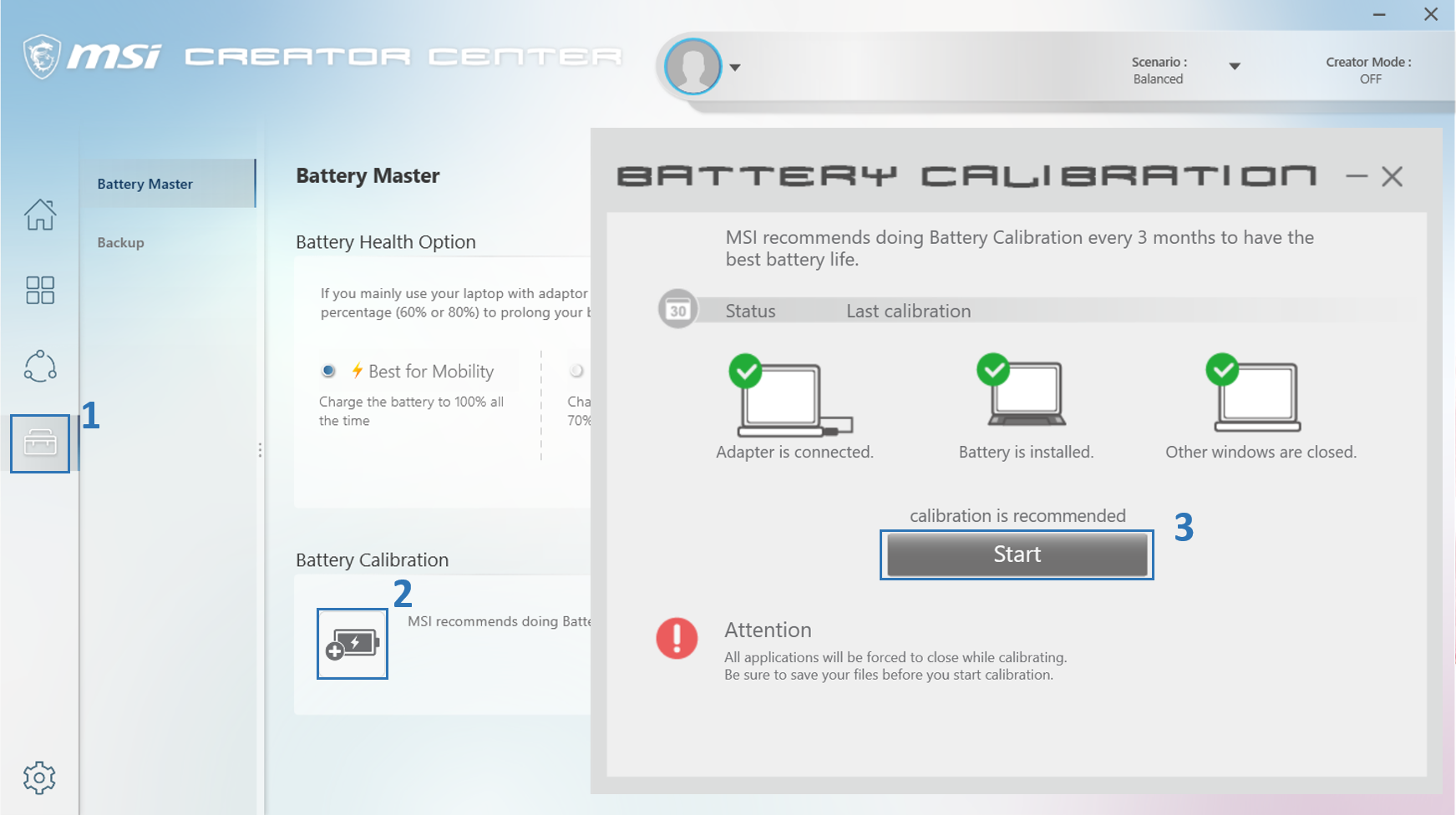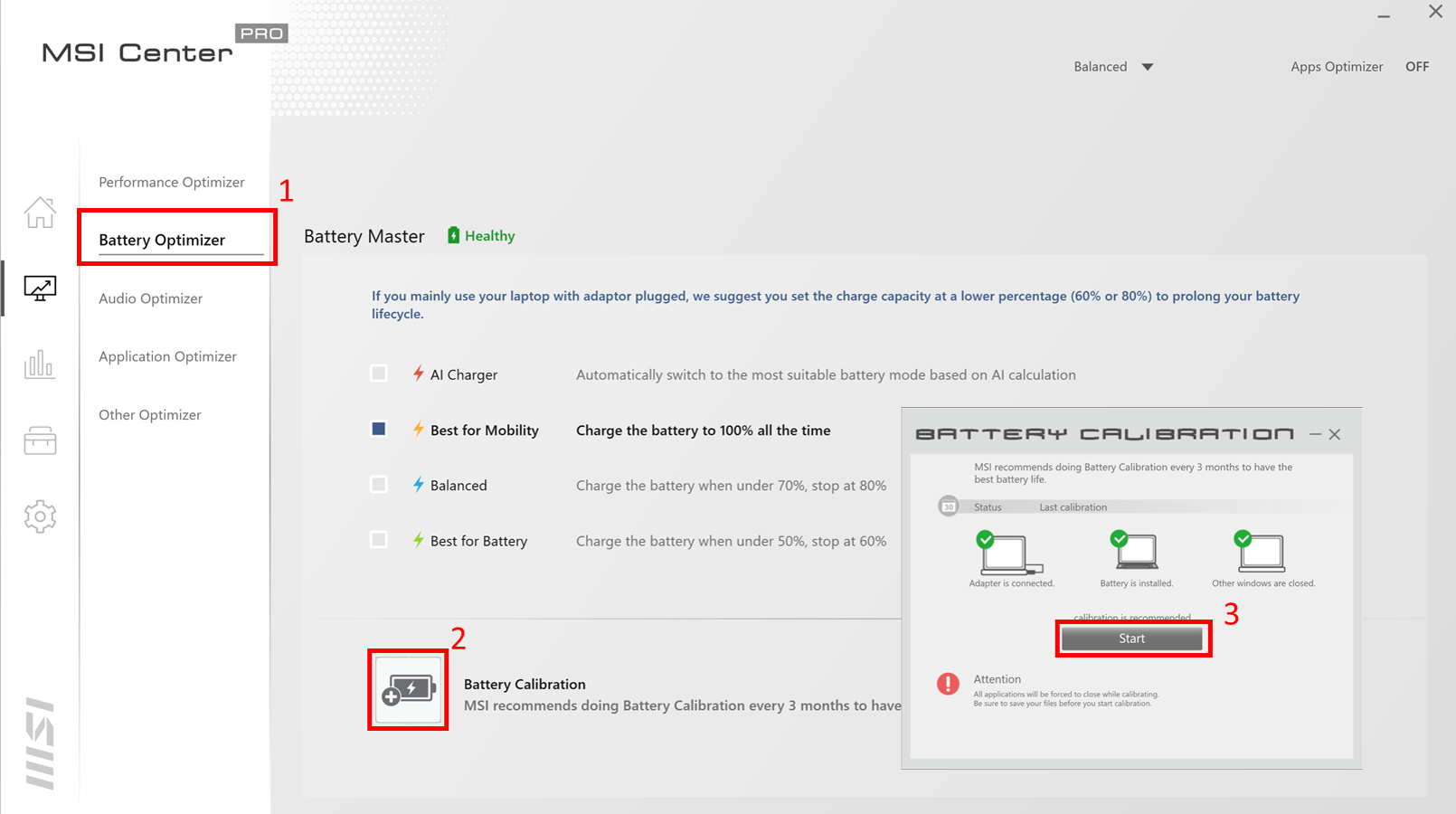 在MSI Center Pro 里,请到Optimization 的 Battery Optimizer页面点击电池校正的图标即可将视窗打开。