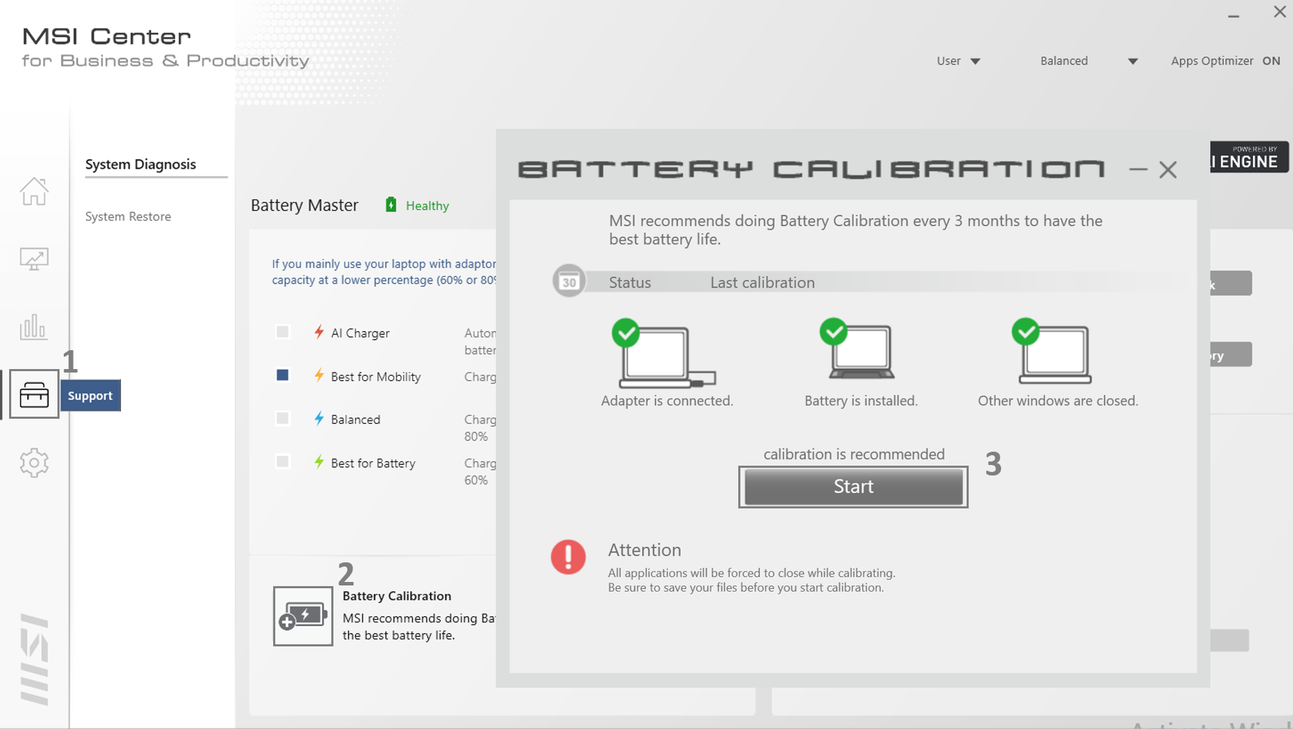 在MSI Center for Business and Productivity 里,请到Support 的System Diagnosis页面点击电池校正的图标即可将视窗打开。