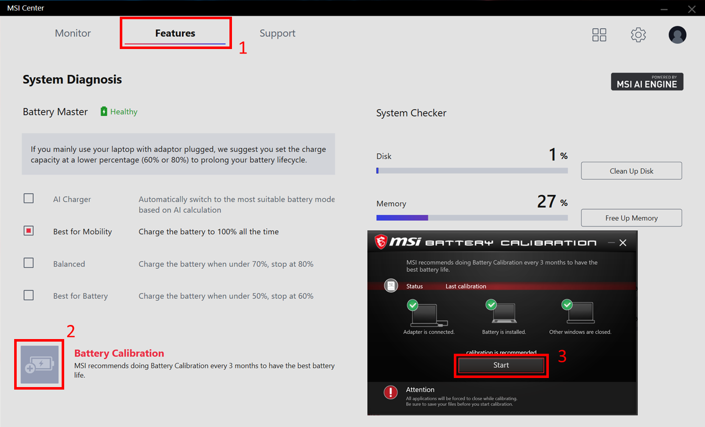 在MSI Center 里,请到Features 下的System Diagnosis 页面点击电池校正的图标即可将视窗打开。