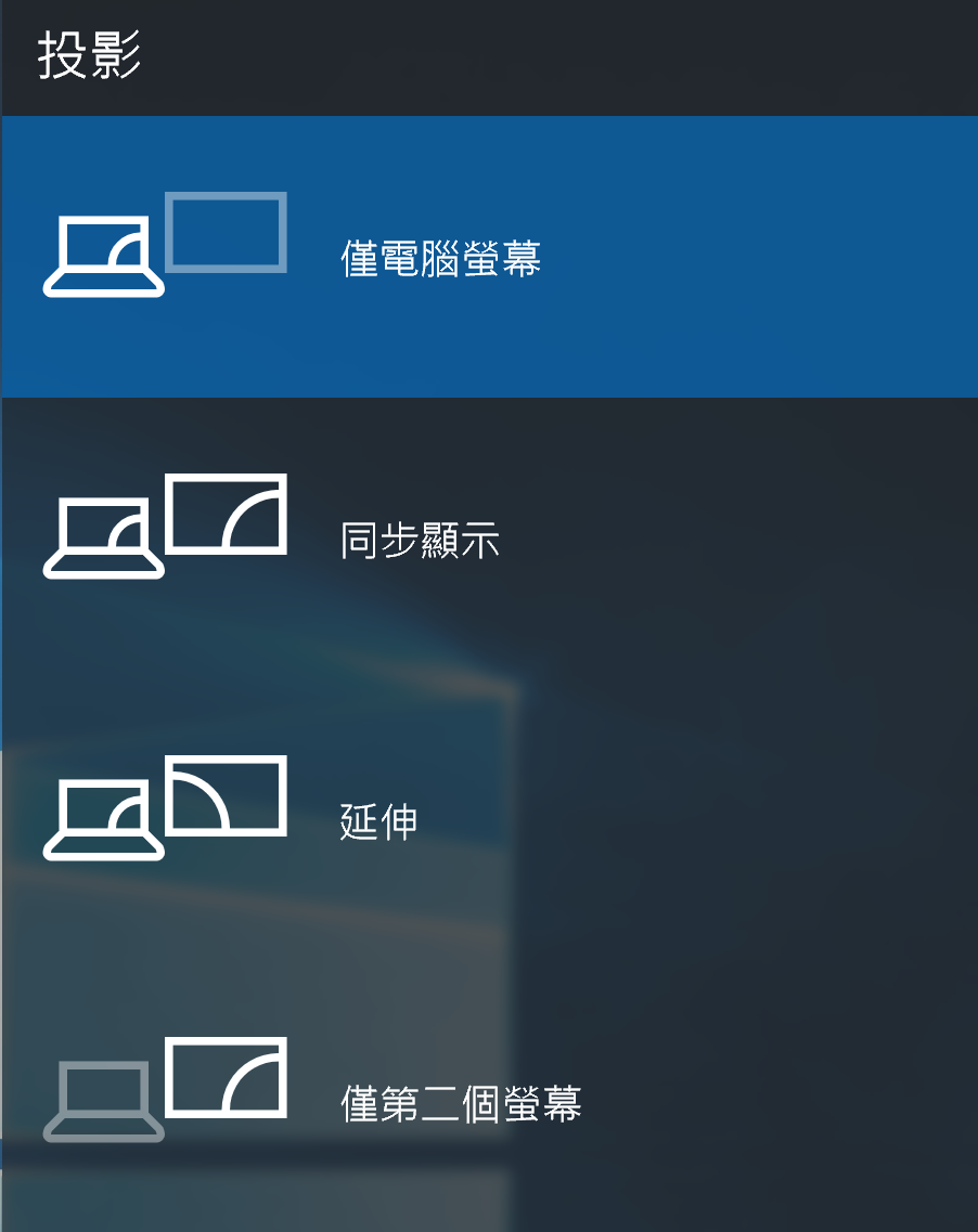在Windows 10下,您可以使用[Windows]键 + [P]键盘快捷键在计算机屏幕、外接屏幕和同步显示/延伸模式之间去切换。这是微软从Windows 7就开始使用的标准规范功能键。