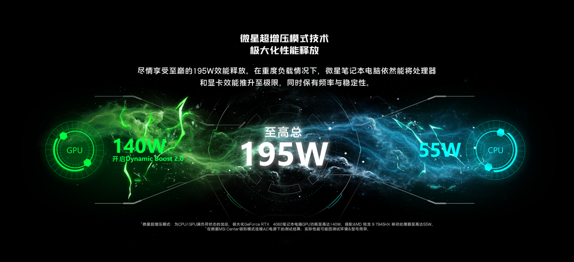 散热规格同样支持到位,双风扇6热管的微星酷寒散热系统足以支撑整机高能输出。微星超增压模式,实现双烤至高195W的性能释放。