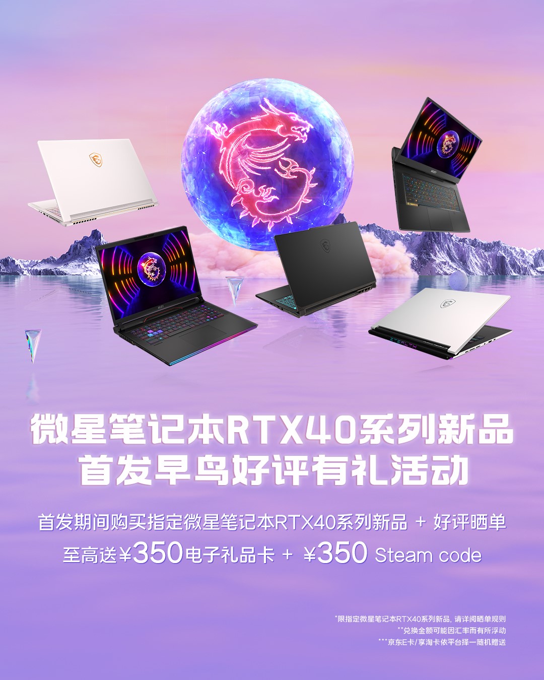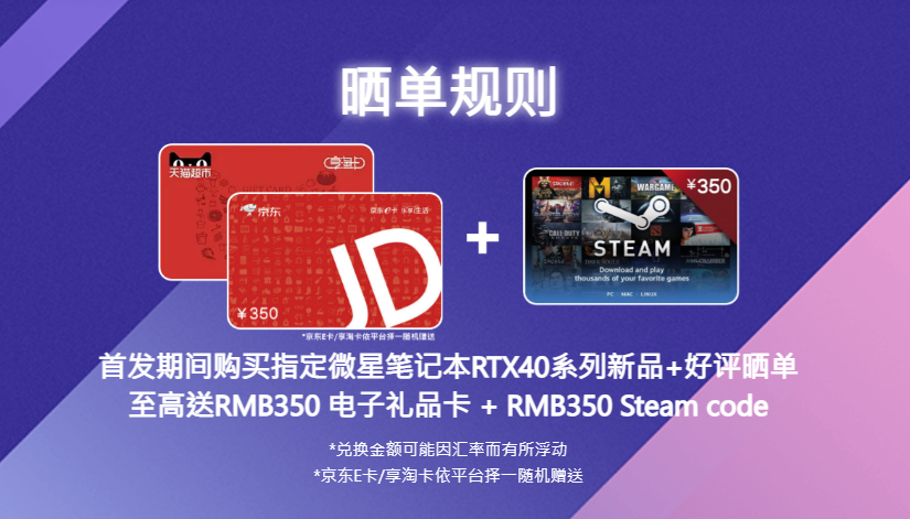 首发期间购买指定微星笔记本RTX40系列新品+好评晒单,至高送350元电子礼品卡 + 350元 Steam Code兑换券!