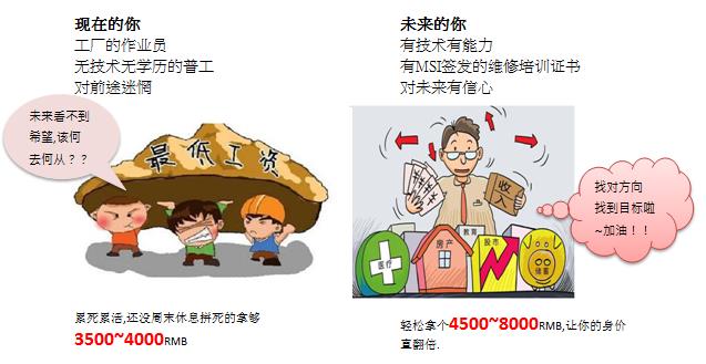2. 如果你毕业后在MSI工作.拿着我们的毕业证书您就可以应聘MSI的维修技术员了,薪资当然比作业员高.所以您短期的投资是有长期回报的。