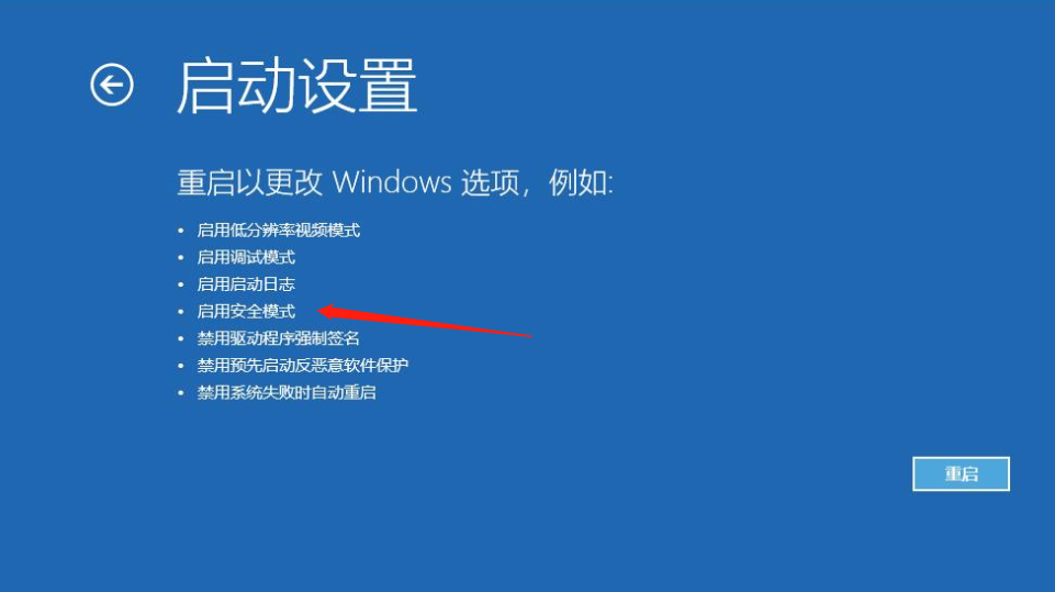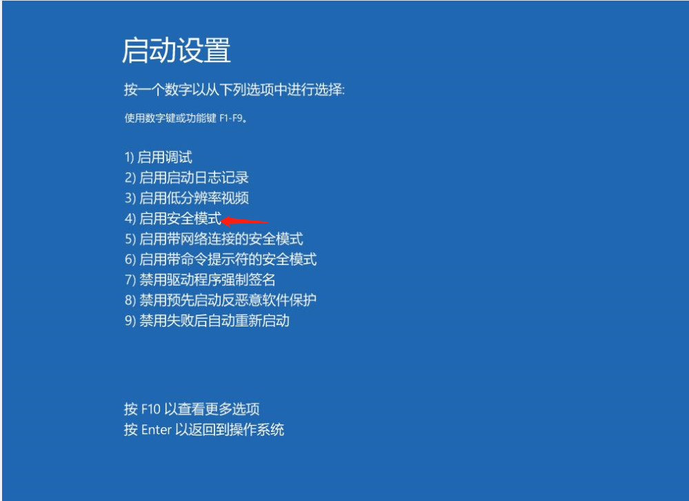 - 计算机自动重启,待出现下面的画面,选择4)即可进入安全模式。
