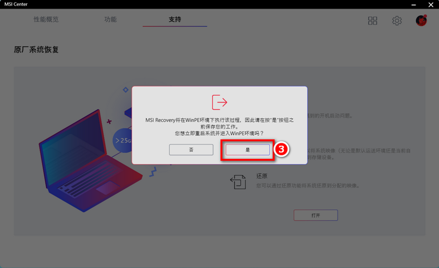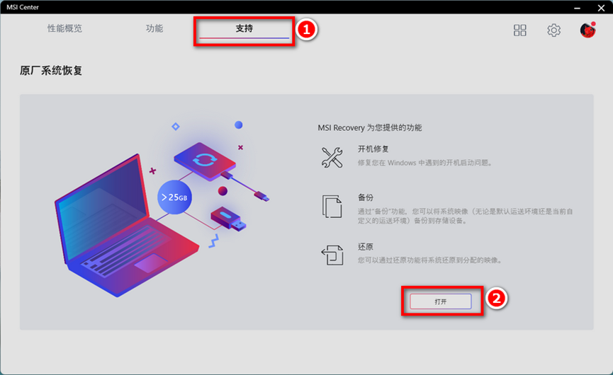 1. 进入 MSI Center →支持→原厂系统恢复,点击「打开」