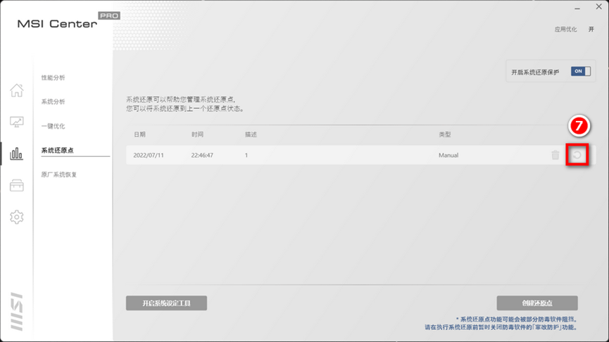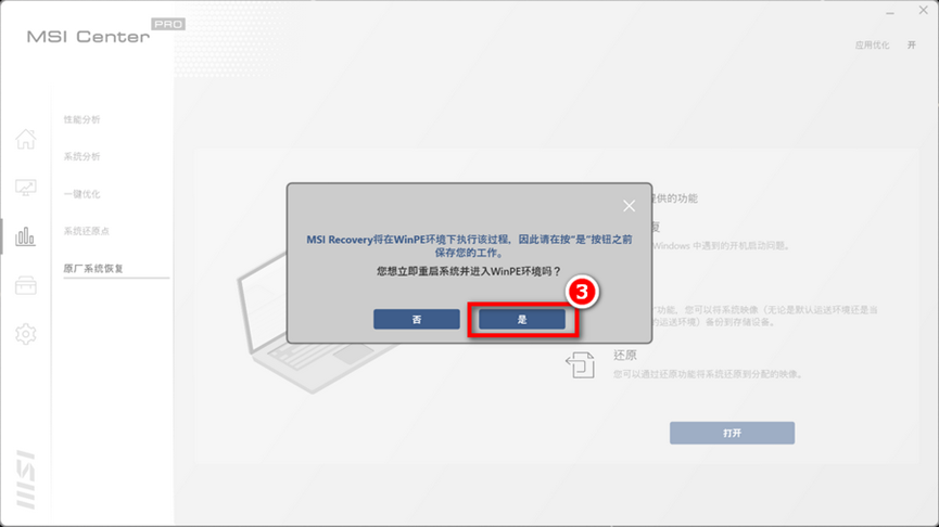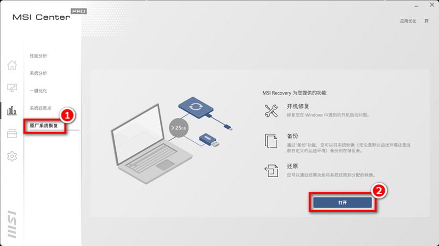 2-1进入 MSI Center Pro→系统诊断→原厂系统恢复,点击「打开」