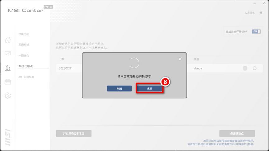 注意: MSI 预安装系统还原会将笔电还原至出厂设定且不会保留任何的系统变更