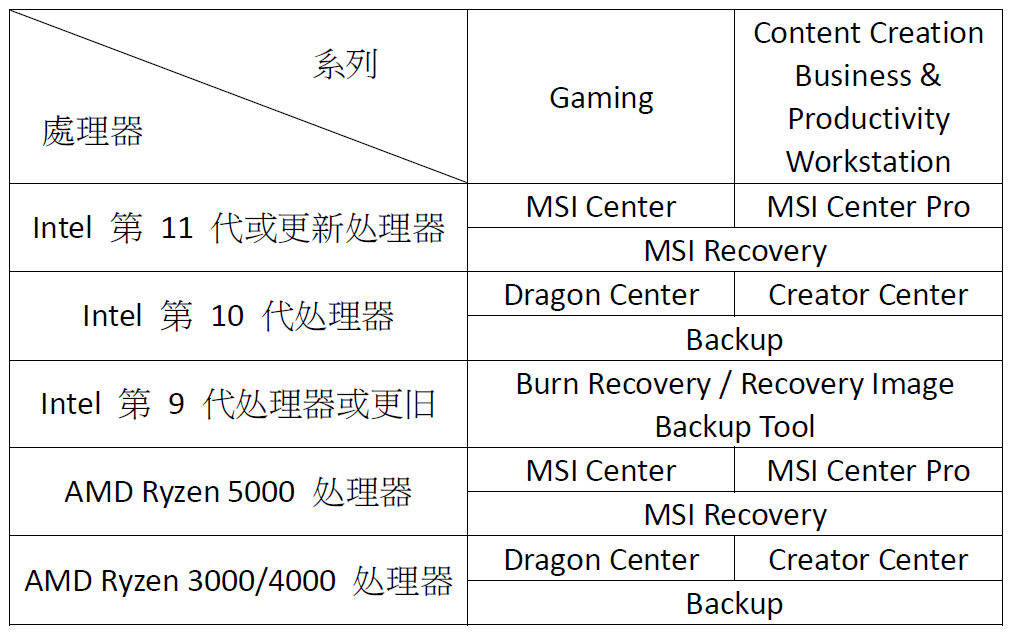 请根据您的计算机配备的处理器选择对应的Center软件进行系统备份。若您的计算机只支持透过Burn Recovery / Recovery Image Backup进行系统备份,请参考如何使用 MSI 内建 Burnrecovery?