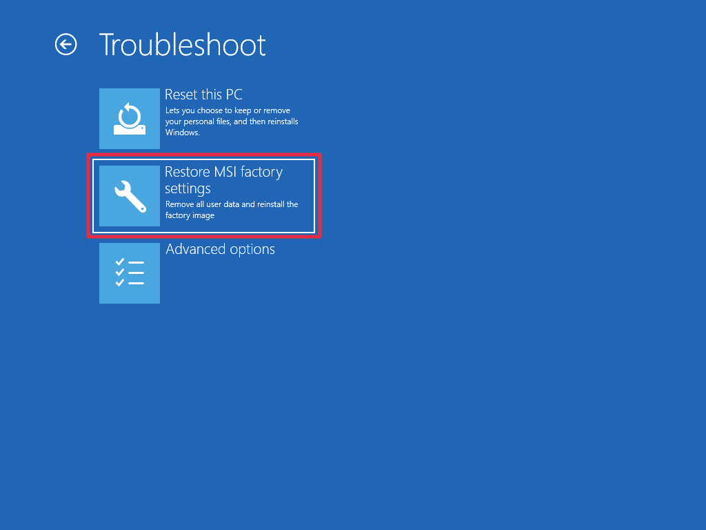 • 以下内容只适用于MSI笔记本电脑且搭配MSI出厂系统的机型,若您的笔记本电脑曾重新安装过系统或系统分区经过任何变更,还原分区可能已经遭到清除或破坏,此情况下将无法适用本文章,若您想重新装回MSI出厂系统请联络您所在区域邻近的维修点。
