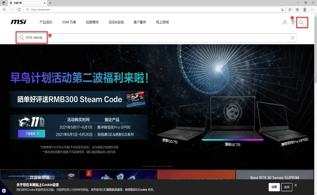 1. 可在微星官网查询笔电是否支持雷电功能,登录官网,在首页输入电脑型号进行查询。