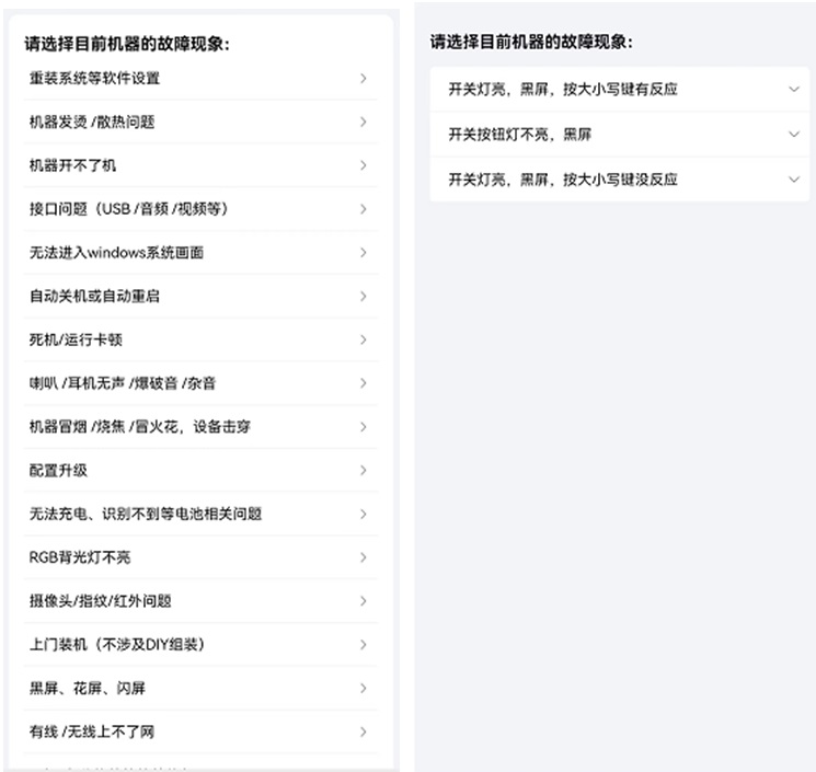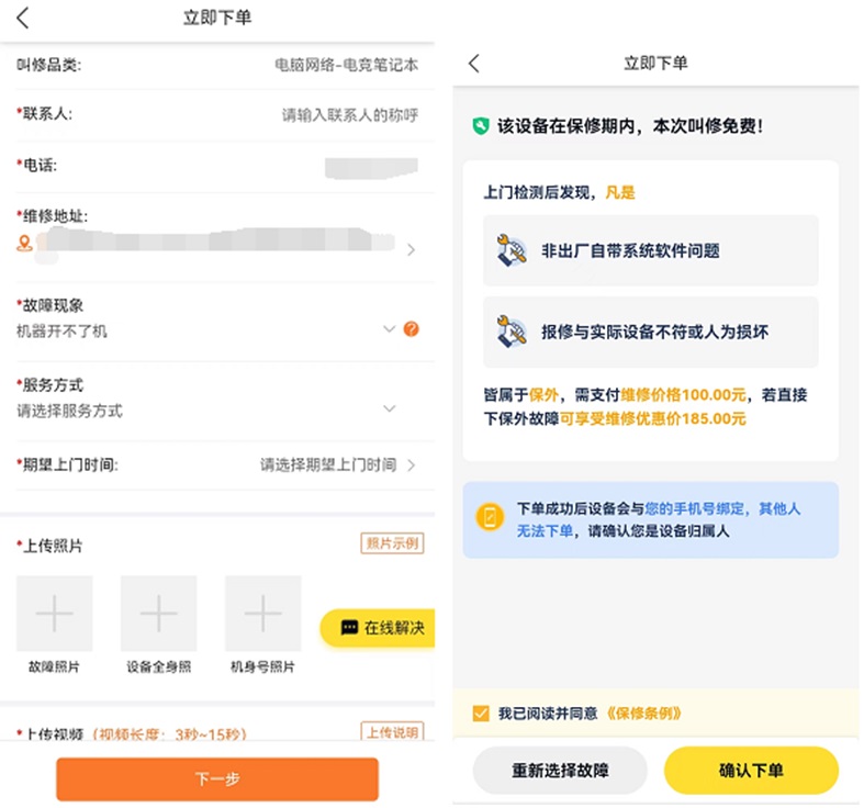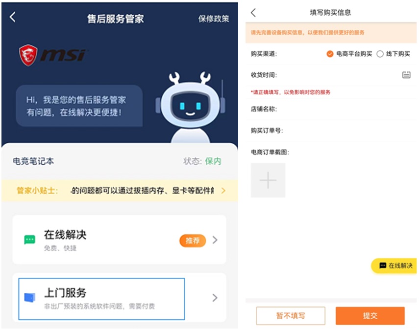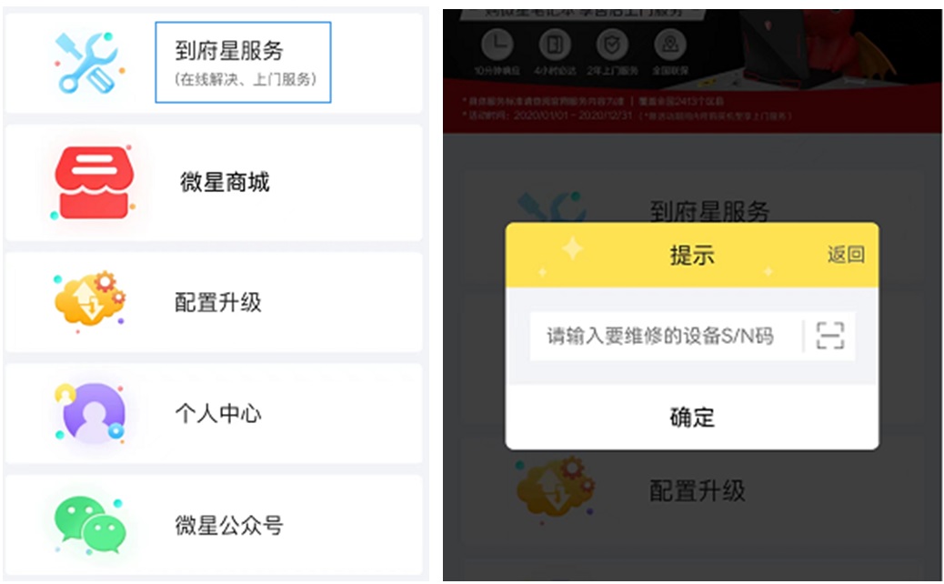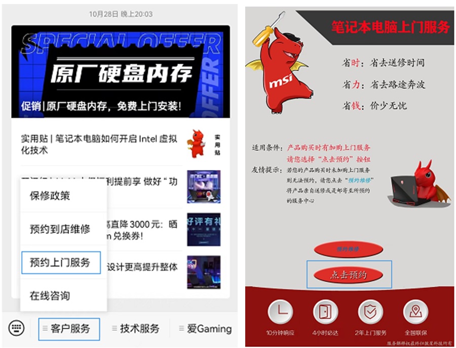 选择您的产品 主板 笔记本 显卡 显示器 桌面电脑 您的评价已经送出, 请告诉我们如何改善。 文章中没有提供资讯能解决我的问题 文章中有提供资讯,但不能解决我的问题 文章内容有误 文章内容过旧 图片不清楚 操作步骤不够详细 文章超连结失效 文章太冗长,不易阅读 其他建议: : 请勿在建议中提到个人相关资讯。 If you need further support, please contact MSI with... Hot_Line Ask a question None 感谢您的宝贵意见 返回 桌面计算机线上维修申请服务 December 5,2022 *提醒您产品若已过保修期限请直接前往各地 服务站点 送修 1. 请您关注微信公众号“微星客户关怀中心”或扫描如下二维码关注2. 关注后选择“客户服务“——“预约上门服务”——“点击预约”3. 在弹出页面中选择“到府星服务”,输入或扫一扫您的产品S/N4. 选择“上门服务”,“ 填写购买信息”后提交5. 选择您产品目前出现的“故障现象”6. 填写相关信息,包含姓名、服务方式、期望上门时间、上传相关照片及视频、故障描述,点击下一步,勾选“我已阅读并同意《保修条例》”,确认下单即可 如需疑难排查說明,请联络我们的客户支援团队。• 热线在线及时客服• 在线留言提问 Survey 线上即时客服 Feedback Yes No 本则解答是否有帮助? 我们致力于提供更好的客户体验,请告知我们您的反馈意见 Yes No